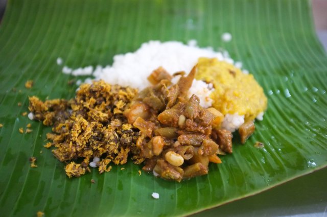 As far as street food and kades in Colombo go, the Yarl Eat House is one of the best. The basic Yarl meal (for lunch) is rice on a banana leaf with three veg sides that they ladle onto your plate – usually purippu, a sort of sambar and something else. On top of this they also give you a metal bowl with your choice of meat sides. The general options are chicken, mutton, prawn, cuttlefish and crab. Half a fish is included without asking. The chicken is a bit bony and unrewarding in our experience, but the other sides are excellent. Yarl is especially famous for its crab which is generous, though it brings your price of meal up a bit.