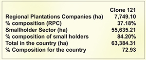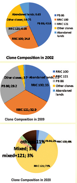 The fact remains that RPCs, RDD and private sector nursery owners have not strictly adhered to the basket of specific clones advocated by the RRI. Both RDD and private nurseries are primarily responsible for the issue of plants to the smallholders and they are duty bound to issue plants in keeping with the RRI specifications. It is abundantly clear that this requirement has not been complied with. How come the rubber smallholders have cultivated an excessive hectarage of 55,635 with a single clone of RRIC 121, covering an extent of almost 84.20% of the cultivation as seen above. If a leaf disease attacks this clone, total extent of rubber of 46,355 ha will have to be destroyed. It is unfortunate that our stakeholders have not realised this situation.