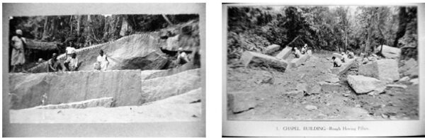 When work commenced on the chapel there were no contractors willing to tender for the contract, and no estimates could be prepared either. There were no written specifications for the kind of work that had to be done, nor were there any living souls with the requisite building experience. Rev. Gaster wanted to use the same old granite, hewn in blocks as gigantic as in the olden days. He envisioned a forest of stone pillars, fifty-four in number, each sixteen feet high and two feet square, intricately decorated and capped with bell-like carved wooden “pekadas“. They were to stand on a stone platform four feet high – “high enough for shelter, but not too high to look across, whether seated or standing, through the avenue of columns, to the sunset glow on the hills beyond”.