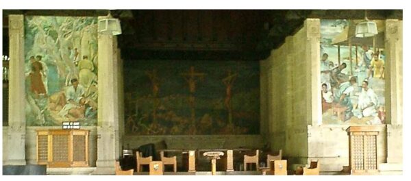 The final works of art were the four marvellous murals painted by David Paynter O.B.E, a Member of the Royal Academy, and an old pupil of Trinity. He began his labour of love in 1929 when only the side chapel was roofed and completed. The murals, as seen today, are all in his inimitable style, and though the scenes are Biblical, they have a tropical colour and a unique local setting to match the Kandyan architecture itself.