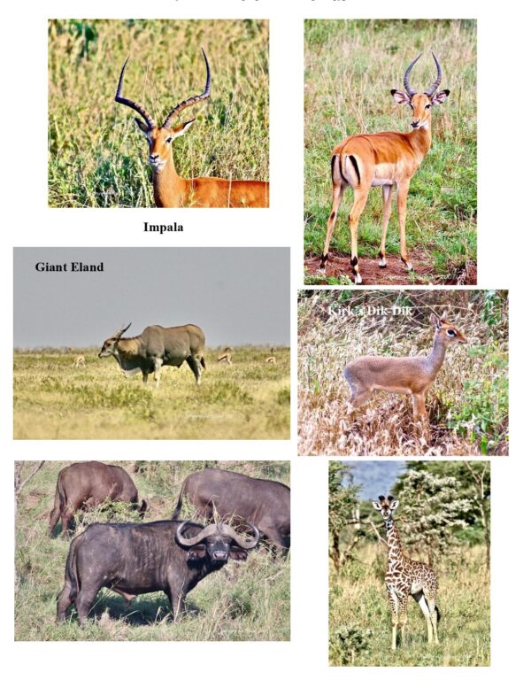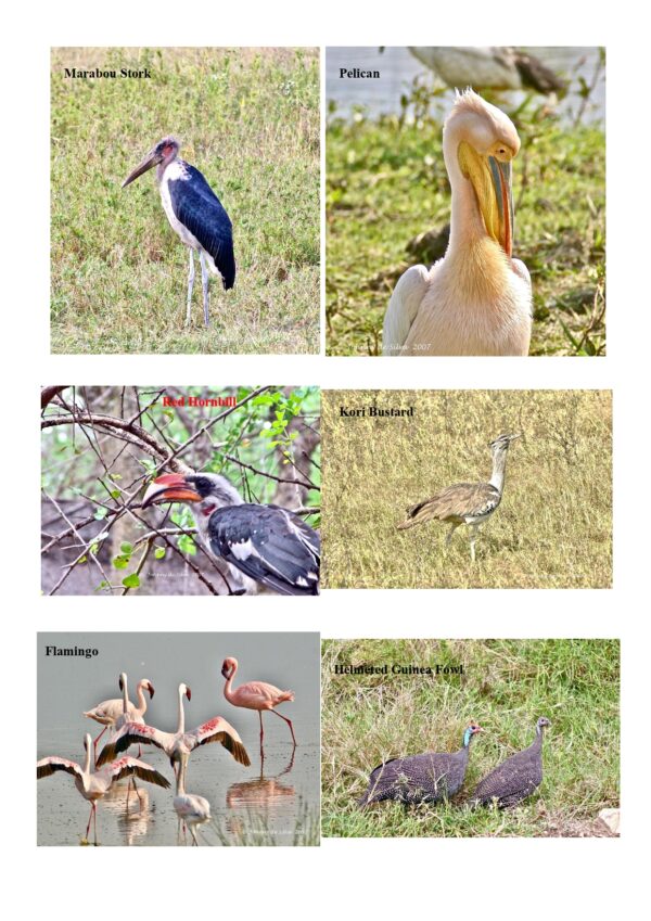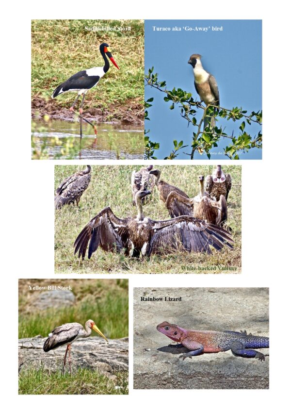 To keep our interest going there were the Thompson’s gazelles, Impala, Kudu, Water buck, Baboons, Vivid monkeys with their iridescent blue bottoms, huge Crocodiles, Dik-diks and other smaller animals. The birds were represented by the Ostrich, Vultures, Storks, Heron, Eagle, Bee Eater, Horn Bills, Owl, Starling – of which the Magnificent one was an iridescent blue, Hamerkop, Crowned Crane, Kori Bustard, Go-away bird, Pelican, gorgeous Flamingo, Egyptian Geese and several others.