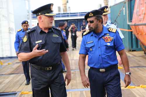 Commanding Officer of Ocean Shield, Alan Champkin conducts a tour of Ocean Shield for RADM Travis Sinnah, Sri Lankan Navy Eastern Commander