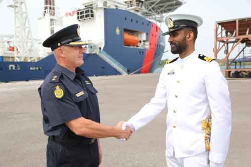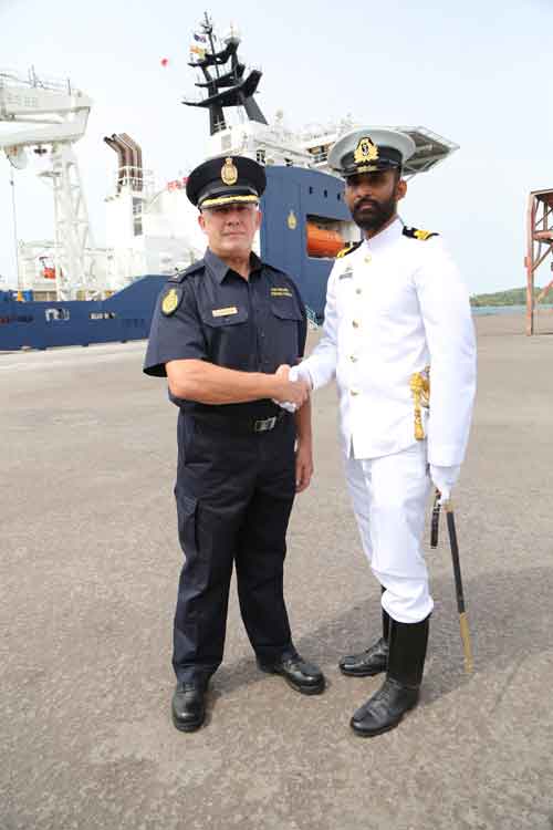 Officer of the Guard, Lieutenant PJ Bakelmun welcomes Commanding Officer of Ocean Shield, Superintendent Alan Champkin to Sri Lanka