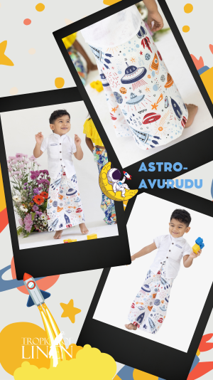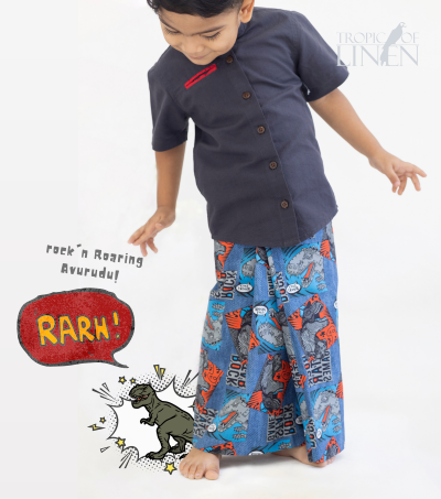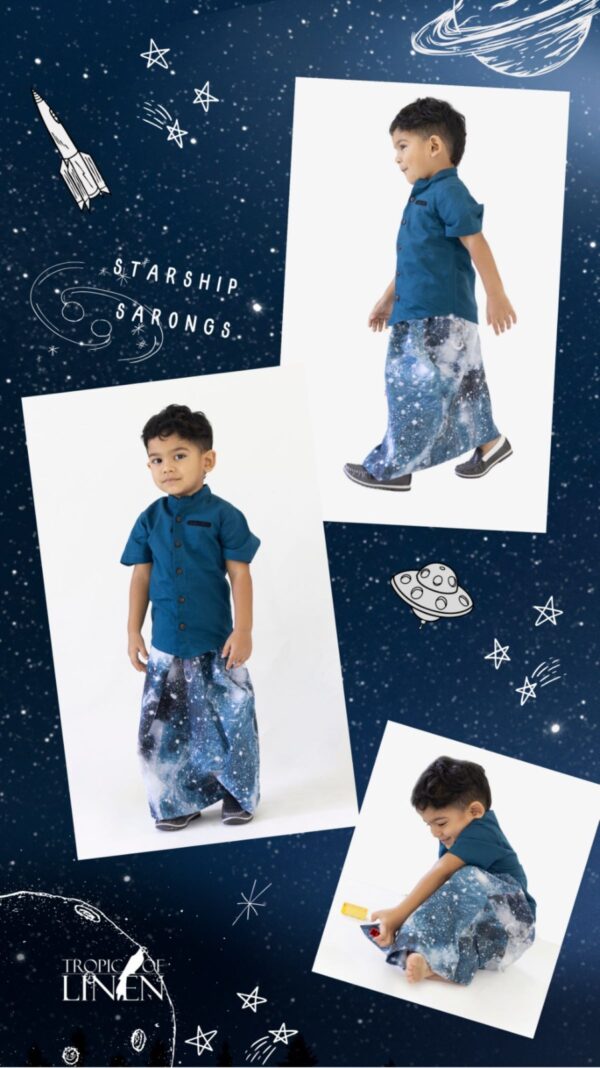 Tropic Of Linen has not forgotten the little gents of course, with sarong-shirt sets featuring lively and contemporary prints and designs. For the toddler age group the sarongs come in fun and cutesy prints, while the older ‘big boys’ can rock more modern and edgy motifs. Blast off into unknown galaxies or astro surf to the stars with out of this world space-inspired sets. Even unleash their inner dinosaur with some rock n’ roaring outfits. Easy-to-wear expandable hidden belts come built in to each sarong, so both kids and parents feel secure in knowing the sarong will hold up to all play!