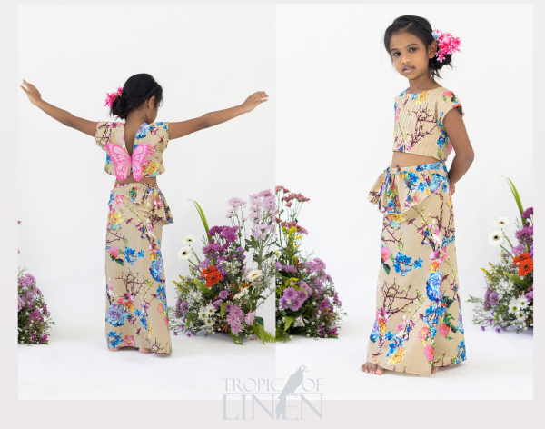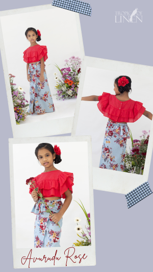 Tropic Of Linen has also crafted a delicate and whimsical outfit filled with old world charm and a more elegant quality -the ‘Avurudu Rose’-, featuring exquisite red roses and flowers on a dreamy soft blue background.