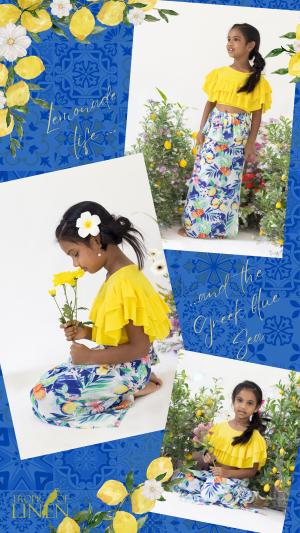 The serene island girl, amidst sunny lemons and the blue ocean will be fresh, bright, and beaming in the Santorini-inspired vintage style set.
