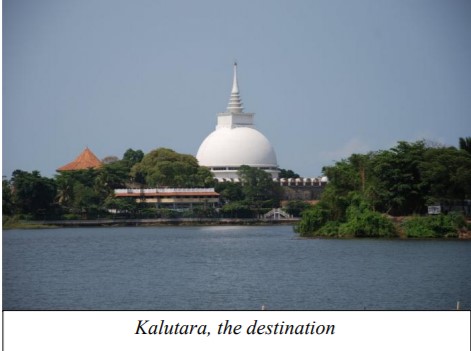 along, as graceful as ever. Our paddles dipped, and our hearts sang, as we inched our way to the destination. We came around the last bend and there loomed in all its majesty, the shining white dagaba of the Kalutara Pansala. It is a sight to remember, the two bridges linking the banks, the sea in the far horizon, and the temple dominating a clear blue sky.