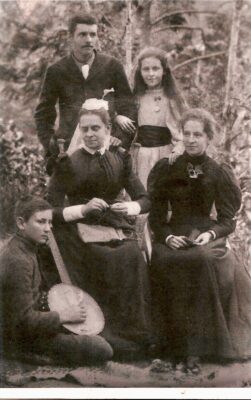 A photo shows Mrs. Braine and her children at Nuwara Eliya. The older son, Charles Stanley (my grandfather), was already a planter in the North Western Province, and would have been visiting. In the photo, Muriel, his youngest sister, has her arm circling his. Sister Eudora, perhaps in her early twenties, is seated alongside Mrs. Braine. Younger brother William is seated on the ground, on a leopard skin, holding a banjo. This could have been a Christmas gathering. The leopard may have been shot by Mr. Braine, who appears with a double-barreled shotgun in his photo and may have liked to hunt. Leopards were a threat to estate workers.
