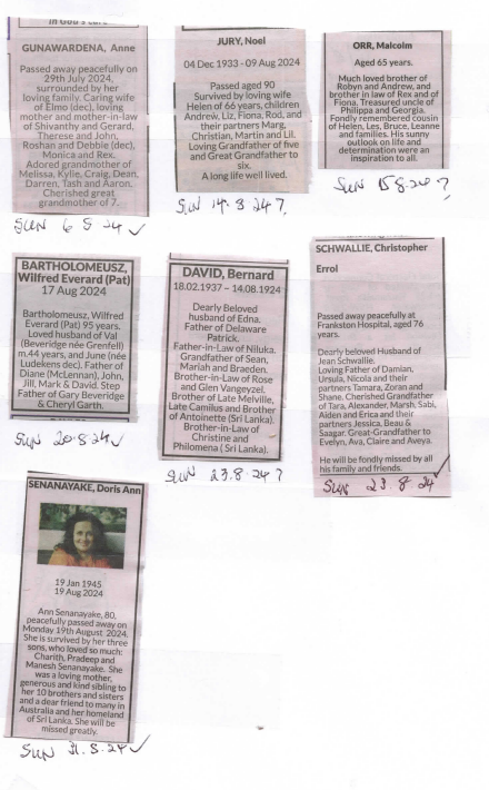 ObituariesVictor Melder CLASSIFIED NOTICES – AUGUST 2024 Last updated: September 7, 2024 9:04 am By eLanka adminByeLanka admin Share 0 Min Read SHARE CLASSIFIED NOTICES – AUGUST 2024 TAGGED:CLASSIFIED NOTICES - AUGUST 2024 Share This Article Email Copy Link Print Previous Article Be Still-and Know – By Oscar Fernando Next Article Australian Citizenship Day, 17 September FacebookLikeYoutubeSubscribeLinkedInFollow Most Read “A PICTURE SPEAKS A 1000 WORDS” – By Des Kelly A Life Hack for when we’re Burnt Out & Broken Down – By Uma Panch Narration of the History of our Proud Ancestral (Orang Jawa) Heritage. by Noor R. Rahim eLanka Marriage Proposals Noel News Noel News- By Noel Whittaker EILEEN MARY SIBELLE DE SILVA (nee DISSANAYAKE) – 29 September 1922 – 6 April 2018 – A Woman of Value an Appreciation written by Mohini Gunasekera K.K.S. Cement Factory Dr.Harold Gunatillake’s 90th Birthday party Cricket: Sri Lanka’s women’s squad in Melbourne - Advertisement -
