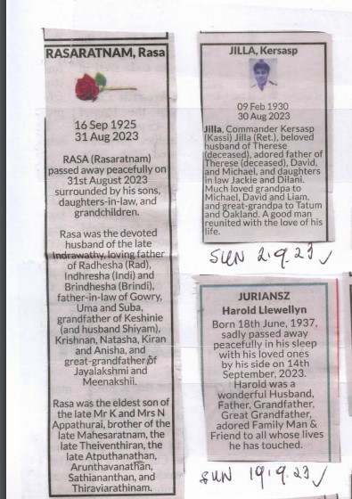 Obituaries CLASSIFIED NOTICES – SEPTEMBER 2023 Last updated: October 1, 2023 1:30 pm By eLanka adminByeLanka admin Share 0 Min Read SHARE CLASSIFIED NOTICES – SEPTEMBER 2023 TAGGED:CLASSIFIED NOTICES - SEPTEMBER 2023 Share This Article Email Copy Link Print Previous Article Bradman at Brockton Oval in Vancouver in 1932 during Australian North American Tour-by Michael Roberts Next Article The Dutch Fort in Gurunagar, Jaffna – By Michael Roberts FacebookLikeYoutubeSubscribeLinkedInFollow Most Read “A PICTURE SPEAKS A 1000 WORDS” – By Des Kelly A Life Hack for when we’re Burnt Out & Broken Down – By Uma Panch Narration of the History of our Proud Ancestral (Orang Jawa) Heritage. by Noor R. Rahim eLanka Marriage Proposals Noel News Noel News- By Noel Whittaker EILEEN MARY SIBELLE DE SILVA (nee DISSANAYAKE) – 29 September 1922 – 6 April 2018 – A Woman of Value an Appreciation written by Mohini Gunasekera K.K.S. Cement Factory Dr.Harold Gunatillake’s 90th Birthday party Cricket: Sri Lanka’s women’s squad in Melbourne - Advertisement -