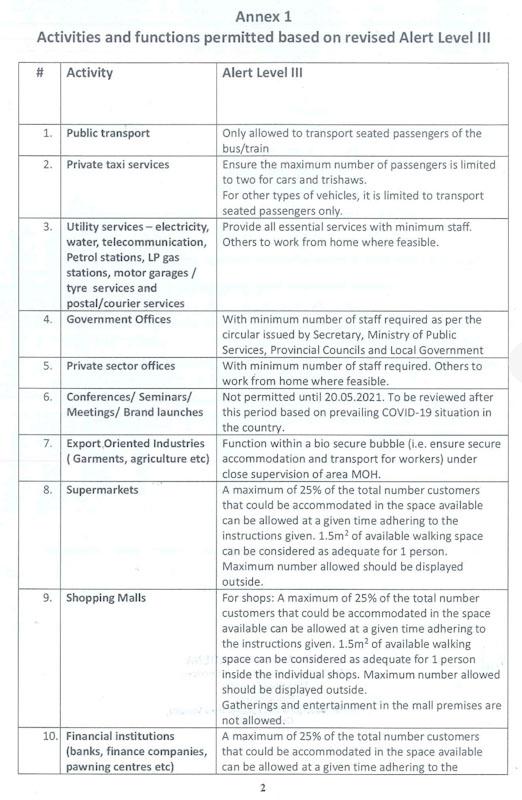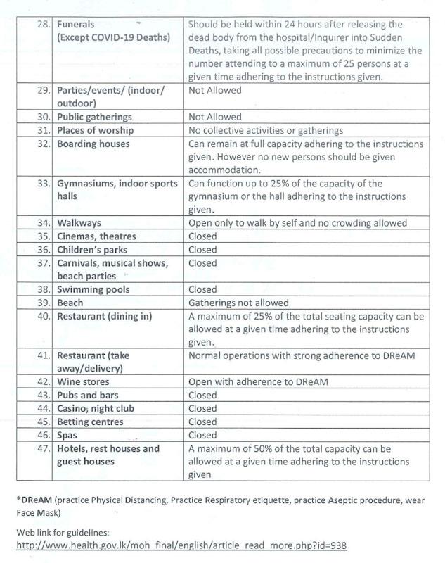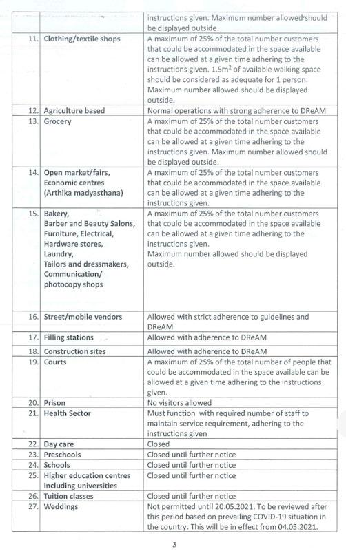 Meanwhile, wedding functions will not be permitted to held until May 20. This will be reviewed after that particular period based on the prevailing COVID-19 situation in the country. This will come to effect from May 4, the Ministry said.