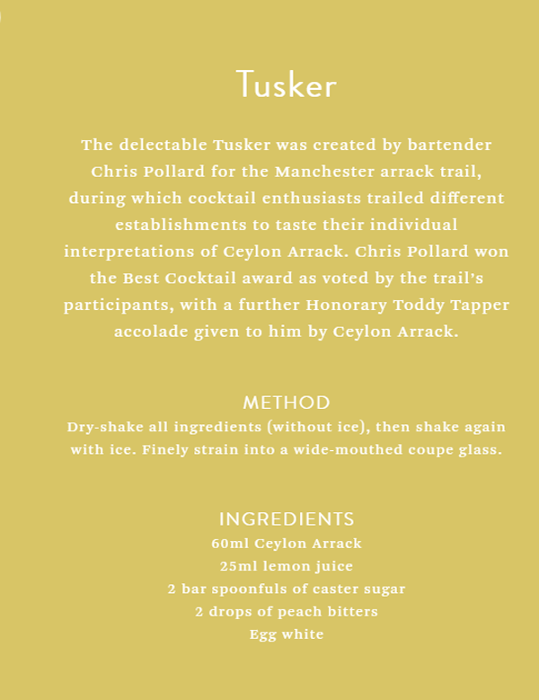 General Sir John Gayer, an English governor of Bombay for the East India Company, first penned this recipe in the 17th century. It is a delicious blend of lime juice, jaggery reduction, nutmeg and tea, which Carl Anthony Brown of the chic Dishoom restaurant in London recently reinterpreted using Ceylon Arrack. Finely crafted, full of flavour and fit for a roomful of dignitaries, this is a recipe that will last for centuries yet.