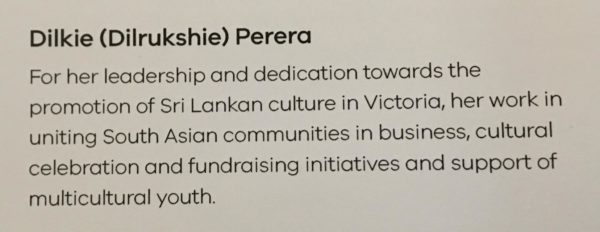 Balwyn resident Dilkie (Dilrukshie) Perera is the latest recipient of the coveted Victorian Government’s Multicultural Award for Excellence – Meritorious Service to the Community. This award recognises her 20 years of outstanding service to the community, her leadership and dedication towards the promotion of Sri Lankan culture in Victoria, her work in uniting South Asian communities in business, cultural celebration and fundraising initiatives, and her support and empowerment of multicultural youth.
