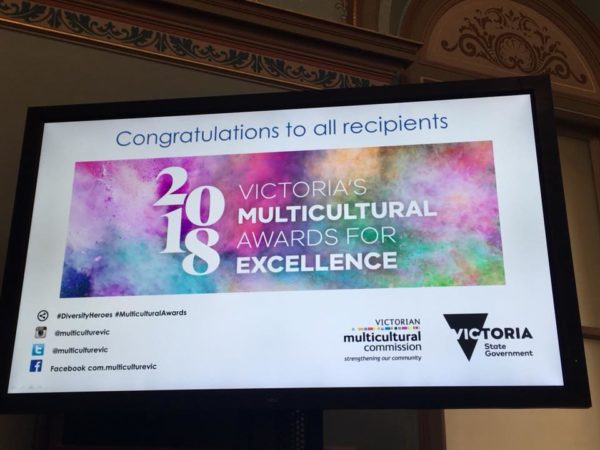 She was presented with the award by the Victorian Multicultural Commission Chairperson Helen Kapalos, in the presence of the Governor of Victoria Hon Linda Dessau AC and the Minister for Multicultural Affairs Hon Robin Scott MP.