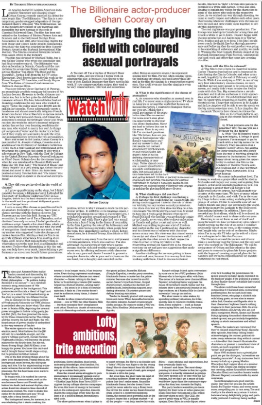 Los Angeles-based Sri Lankan-American independent filmmaker and classical singer Gehan Cooray, recently unveiled his debut feature length film ‘The Billionaire.’ The film is a contemporary, gender-swapped adaptation of George Bernard Shaw’s 1930s play ‘The Millionairess,’ set in the modern day context of gay marriage and asexuality, but pays homage to the style of Classical Hollywood films. The film has been submitted to the Academy of Motion Picture Arts and Sciences and to the Hollywood Foreign Press Association in late 2020, after becoming eligible for both Oscar and Golden Globe awards nominations. Previously the film was awarded the Best Comedy Feature Award at the Burbank International Film Festival. The film has received favorable reviews from select critics in the industry.