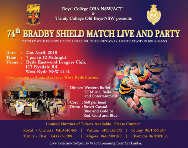 74th Bradby Shield Match Live and Party (Sydney Event) Last updated: March 18, 2018 5:13 am By eLanka adminByeLanka admin Share 1 Min Read SHARE Royal College OBA NSW/ACT * Trinity College Old Boys – NSW Presents 74th Bradby Shield Match Live and Party (Sydney Event) 21st April 7pm to 12 Midnight Live Telecast – Subject to Web streaming from Sri Lanka Ryde Eastwood Leagues Club, 117 Ryedale Road, West Ryde, NSW 2114 Cost: $60 per head Dress – Smart Casual: Blue & Gold or Red, Gold and Blue Dinner: Western Buffet DJ Music, Baila and Entertainment Tickets: Royal – Chanaka 0410 640 445 | Varuna 0401 148 332 | Soumy 0431 155 519 Trinity – Thari 0433 756 288 | Migara 0416 980 020 | Chamindu 0410 289 135 Free Parking Share This Article Email Copy Link Print Previous Article The Centenary Cricket Match – Trinity College OBA Mebourne vs St Anthony’s College OBA Melbourne Next Article Saints of Nugegoda – 10th Anniversary Dinner Dance (Melbourne Event) Leave a Comment Leave a ReplyYou must be logged in to post a comment. FacebookLikeYoutubeSubscribeLinkedInFollow Most Read “A PICTURE SPEAKS A 1000 WORDS” – By Des Kelly A Life Hack for when we’re Burnt Out & Broken Down – By Uma Panch Narration of the History of our Proud Ancestral (Orang Jawa) Heritage. by Noor R. Rahim eLanka Marriage Proposals Noel News Noel News- By Noel Whittaker EILEEN MARY SIBELLE DE SILVA (nee DISSANAYAKE) – 29 September 1922 – 6 April 2018 – A Woman of Value an Appreciation written by Mohini Gunasekera K.K.S. Cement Factory Dr.Harold Gunatillake’s 90th Birthday party Cricket: Sri Lanka’s women’s squad in Melbourne - Advertisement -