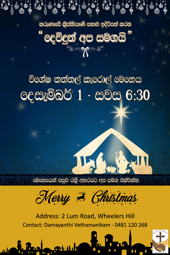 Compassion Christian Church presents “God Is With Us” – Sri Lankan Christmas Carol Service Last updated: November 8, 2018 11:44 am By eLanka adminByeLanka admin Share 0 Min Read SHARE Compassion Christian Church presents “God Is With Us” – Sri Lankan Christmas Carol Service Share This Article Email Copy Link Print Previous Article The Silver Fawn Club presents – 2018 Gala New Years Eve Dinner Dance Next Article LIONS CLUB OF DANDENONG SUPPER INC, (District 201-V5) Leave a Comment Leave a ReplyYou must be logged in to post a comment. FacebookLikeYoutubeSubscribeLinkedInFollow Most Read “A PICTURE SPEAKS A 1000 WORDS” – By Des Kelly A Life Hack for when we’re Burnt Out & Broken Down – By Uma Panch Narration of the History of our Proud Ancestral (Orang Jawa) Heritage. by Noor R. Rahim eLanka Marriage Proposals Noel News Noel News- By Noel Whittaker EILEEN MARY SIBELLE DE SILVA (nee DISSANAYAKE) – 29 September 1922 – 6 April 2018 – A Woman of Value an Appreciation written by Mohini Gunasekera K.K.S. Cement Factory Dr.Harold Gunatillake’s 90th Birthday party Cricket: Sri Lanka’s women’s squad in Melbourne - Advertisement -