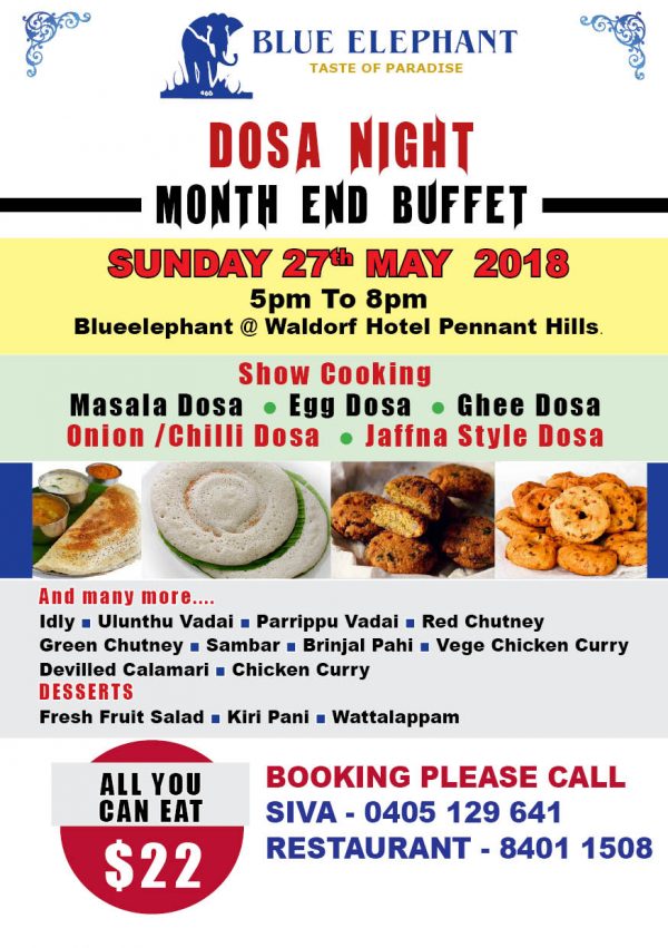 Dosa Night – Month End Buffet – @ the Blue Elephant (Sunday 27th May 2018) – Sydney Event Last updated: May 14, 2018 12:19 pm By eLanka adminByeLanka admin Share 0 Min Read SHARE Dosa Night – Month End Buffet – @ the Blue Elephant (Sunday 27th May 2018) – Sydney Event Share This Article Email Copy Link Print Previous Article A Night of Compassion – by the Sri lankan Association of NSW INC ( 7th July 2018 Sydney Event) Next Article AFTERNOON TEA PARTY Leave a Comment Leave a ReplyYou must be logged in to post a comment. FacebookLikeYoutubeSubscribeLinkedInFollow Most Read “A PICTURE SPEAKS A 1000 WORDS” – By Des Kelly A Life Hack for when we’re Burnt Out & Broken Down – By Uma Panch Narration of the History of our Proud Ancestral (Orang Jawa) Heritage. by Noor R. Rahim eLanka Marriage Proposals Noel News Noel News- By Noel Whittaker EILEEN MARY SIBELLE DE SILVA (nee DISSANAYAKE) – 29 September 1922 – 6 April 2018 – A Woman of Value an Appreciation written by Mohini Gunasekera K.K.S. Cement Factory Dr.Harold Gunatillake’s 90th Birthday party Cricket: Sri Lanka’s women’s squad in Melbourne - Advertisement -