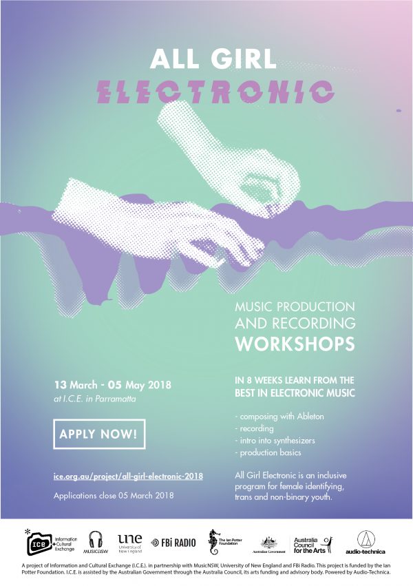 All Girl Electronic is a FREE electronic music production workshop program for young women and non-binary people from Western Sydney. No experience is necessary – just an interest in learning how to produce electronic music. The program is an answer to the call for gender and cultural diversity within the areas of electronic music production and programming.