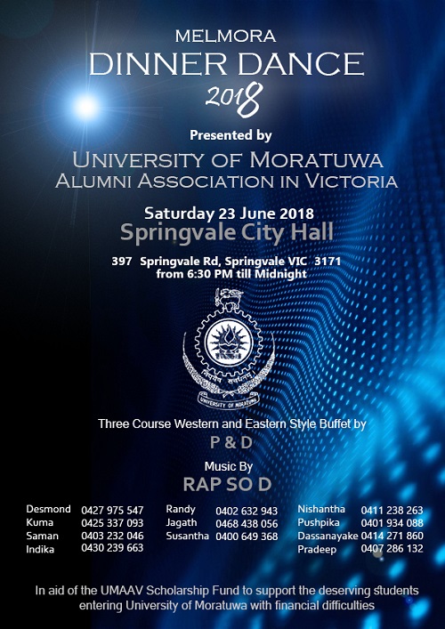 MELMORA DINNER DANCE 2018 – Presented by University of Moratuwa Alumni Association in Victoria ( 23 June 2018 – Melbourne Event) Last updated: April 29, 2018 10:46 am By eLanka adminByeLanka admin Share 0 Min Read SHARE MELMORA DINNER DANCE 2018 – Presented by University of Moratuwa Alumni Association in Victoria ( 23 June 2018 – Melbourne Event) Share This Article Email Copy Link Print Previous Article Old Anandians Association of Victoria – Maroons Night 2018 (19th May 2018 – Melbourne Event) Next Article Old Antonian Social Club – OASC function – Curry Nite – Friday 25th May (Melbourne Event) Leave a Comment Leave a ReplyYou must be logged in to post a comment. FacebookLikeYoutubeSubscribeLinkedInFollow Most Read “A PICTURE SPEAKS A 1000 WORDS” – By Des Kelly A Life Hack for when we’re Burnt Out & Broken Down – By Uma Panch Narration of the History of our Proud Ancestral (Orang Jawa) Heritage. by Noor R. Rahim eLanka Marriage Proposals Noel News Noel News- By Noel Whittaker EILEEN MARY SIBELLE DE SILVA (nee DISSANAYAKE) – 29 September 1922 – 6 April 2018 – A Woman of Value an Appreciation written by Mohini Gunasekera K.K.S. Cement Factory Dr.Harold Gunatillake’s 90th Birthday party Cricket: Sri Lanka’s women’s squad in Melbourne - Advertisement -