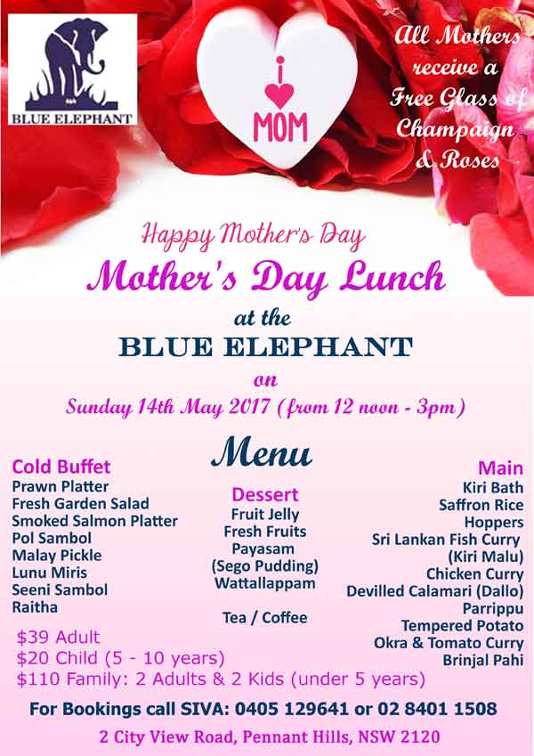 Mothers Day Lunch at the Blue Elephant Last updated: April 10, 2017 5:16 am By admin Share 0 Min Read SHARE Mothers Day Lunch at the Blue Elephant Share This Article Email Copy Link Print Previous Article Classic Songs from bollywood with Srijani Dan Next Article Sydney Tamils Masters – Annual Dinner Dance 2017 FacebookLikeYoutubeSubscribeLinkedInFollow Most Read “A PICTURE SPEAKS A 1000 WORDS” – By Des Kelly A Life Hack for when we’re Burnt Out & Broken Down – By Uma Panch Narration of the History of our Proud Ancestral (Orang Jawa) Heritage. by Noor R. Rahim eLanka Marriage Proposals Noel News Noel News- By Noel Whittaker EILEEN MARY SIBELLE DE SILVA (nee DISSANAYAKE) – 29 September 1922 – 6 April 2018 – A Woman of Value an Appreciation written by Mohini Gunasekera K.K.S. Cement Factory Dr.Harold Gunatillake’s 90th Birthday party Cricket: Sri Lanka’s women’s squad in Melbourne - Advertisement -