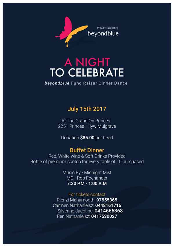 A Night to Celebrate beyondblue Fund Raiser Dinner Dance Last updated: April 1, 2017 7:12 pm By admin Share 0 Min Read SHARE A Night to Celebrate beyondblue Fund Raiser Dinner Dance Share This Article Email Copy Link Print Previous Article Burgher Association Australia Presents A Winter Spit Roast Next Article Tom Jones and Friends Show FacebookLikeYoutubeSubscribeLinkedInFollow Most Read “A PICTURE SPEAKS A 1000 WORDS” – By Des Kelly A Life Hack for when we’re Burnt Out & Broken Down – By Uma Panch Narration of the History of our Proud Ancestral (Orang Jawa) Heritage. by Noor R. Rahim eLanka Marriage Proposals Noel News Noel News- By Noel Whittaker EILEEN MARY SIBELLE DE SILVA (nee DISSANAYAKE) – 29 September 1922 – 6 April 2018 – A Woman of Value an Appreciation written by Mohini Gunasekera K.K.S. Cement Factory Dr.Harold Gunatillake’s 90th Birthday party Cricket: Sri Lanka’s women’s squad in Melbourne - Advertisement -