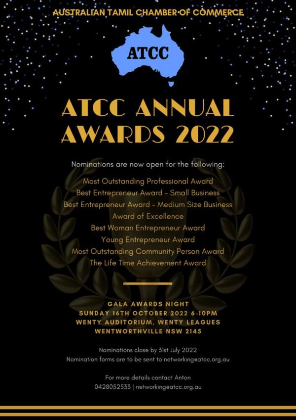 AUSTRALIAN TAMIL CHAMBER OF COMMERCE (ATCC) ANNUAL AWARDS 2022 – 16 October 2022 (Sydney Event)