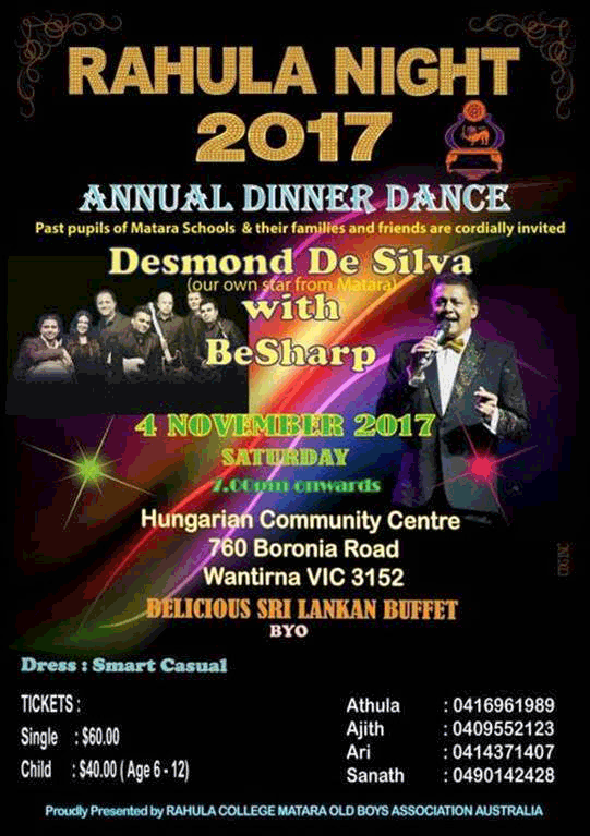 Rahula Night 2017 Last updated: September 25, 2017 7:17 pm By admin Share 0 Min Read SHARE Rahula Night 2017 Share This Article Email Copy Link Print Previous Article Sunil and Nalin Perera Live in Concert Next Article Ceylon Society Talk – Talking Tamil, Talking Saivism in Australia FacebookLikeYoutubeSubscribeLinkedInFollow Most Read “A PICTURE SPEAKS A 1000 WORDS” – By Des Kelly A Life Hack for when we’re Burnt Out & Broken Down – By Uma Panch Narration of the History of our Proud Ancestral (Orang Jawa) Heritage. by Noor R. Rahim eLanka Marriage Proposals Noel News Noel News- By Noel Whittaker EILEEN MARY SIBELLE DE SILVA (nee DISSANAYAKE) – 29 September 1922 – 6 April 2018 – A Woman of Value an Appreciation written by Mohini Gunasekera K.K.S. Cement Factory Dr.Harold Gunatillake’s 90th Birthday party Cricket: Sri Lanka’s women’s squad in Melbourne - Advertisement -