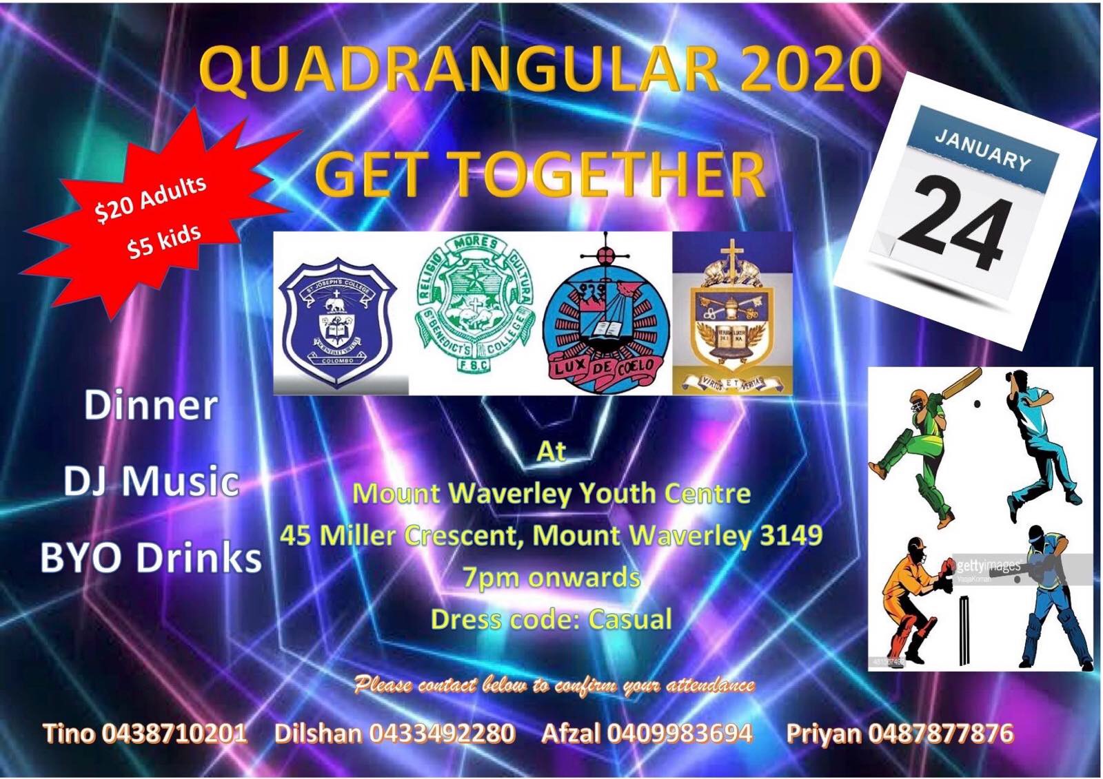 Whilst the get-together is primarily designed to raise funds for the tournament on Monday 27th January, this is also an opportunity for the sport-loving fraternity of all four schools to catch up and reminisce the good old days. We welcome you all to attend in numbers and to pass the word around to the players, partners, past cricketers and well-wishers.