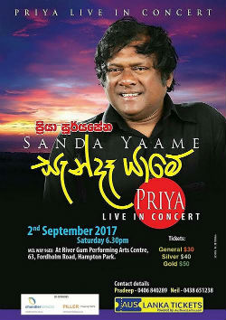 Sanda Yaame – Priya Sooriyasena Last updated: July 24, 2017 6:29 am By admin Share 0 Min Read SHARE Sanda Yaame – Priya Sooriyasena Share This Article Email Copy Link Print Previous Article Colombo Night 2017 Next Article Vishakians of NSW Presents Blossoms of Spring High Tea FacebookLikeYoutubeSubscribeLinkedInFollow Most Read “A PICTURE SPEAKS A 1000 WORDS” – By Des Kelly A Life Hack for when we’re Burnt Out & Broken Down – By Uma Panch Narration of the History of our Proud Ancestral (Orang Jawa) Heritage. by Noor R. Rahim eLanka Marriage Proposals Noel News Noel News- By Noel Whittaker EILEEN MARY SIBELLE DE SILVA (nee DISSANAYAKE) – 29 September 1922 – 6 April 2018 – A Woman of Value an Appreciation written by Mohini Gunasekera K.K.S. Cement Factory Dr.Harold Gunatillake’s 90th Birthday party Cricket: Sri Lanka’s women’s squad in Melbourne - Advertisement -