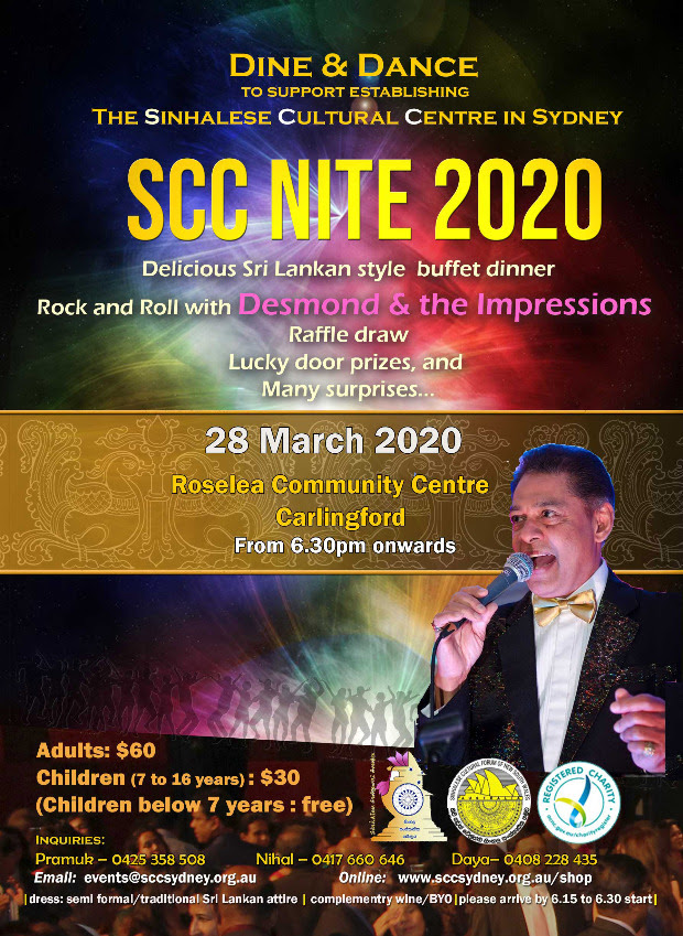 The Sinhalese Cultural Centre will be hosting the annual fundraising dinner SCC Nite 2020, on the Saturday 28th March 2020, at Roselea Community Centre. This is your opportunity to enjoy a great fun filled evening, while supporting the Sinhalese Cultural Centre initiative.