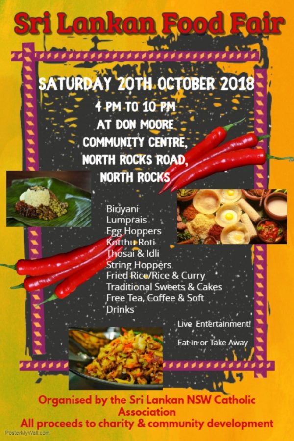 Sri Lanka Food Fair – Organised by the Sri Lankan NSW Catholic Association (Sydney event on 20th October 2018) Last updated: September 2, 2018 12:30 pm By eLanka adminByeLanka admin Share 0 Min Read SHARE Sri Lanka Food Fair – Organised by the Sri Lankan NSW Catholic Association (Sydney event on 20th October 2018) Share This Article Email Copy Link Print Previous Article Shanthi Foundation – CARE BEYOND CURE – Black tie Event – 3rd November 2018 (Sydney Event) Next Article SWINBURNE SRI LANKAN STUDENTS ASSOCIATION Leave a Comment Leave a ReplyYou must be logged in to post a comment. FacebookLikeYoutubeSubscribeLinkedInFollow Most Read “A PICTURE SPEAKS A 1000 WORDS” – By Des Kelly A Life Hack for when we’re Burnt Out & Broken Down – By Uma Panch Narration of the History of our Proud Ancestral (Orang Jawa) Heritage. by Noor R. Rahim eLanka Marriage Proposals Noel News Noel News- By Noel Whittaker EILEEN MARY SIBELLE DE SILVA (nee DISSANAYAKE) – 29 September 1922 – 6 April 2018 – A Woman of Value an Appreciation written by Mohini Gunasekera K.K.S. Cement Factory Dr.Harold Gunatillake’s 90th Birthday party Cricket: Sri Lanka’s women’s squad in Melbourne - Advertisement -