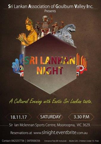 “Sri Lankan Association of Goulburn Valley” is organizing a Sri Lankan Cultural Evening with the objective of promoting the rich culture of Sri Lanka and to create harmony among different communities in our region. The evening will showcase Sri Lankan dancing, music and a variety of cultural events followed by a traditional Sri Lankan Dinner.