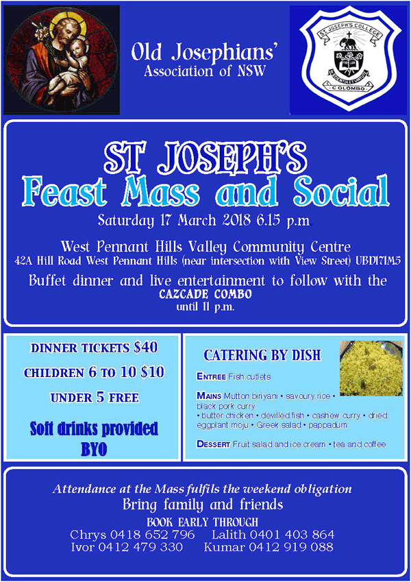ST Joseph’s Feast Mass and Social Last updated: January 30, 2018 7:08 pm By admin Share 0 Min Read SHARE Share This Article Email Copy Link Print Previous Article National Independence Day Next Article Voice.Print in concert from Sri Lanka (in Sydney) Leave a Comment Leave a ReplyYou must be logged in to post a comment. FacebookLikeYoutubeSubscribeLinkedInFollow Most Read “A PICTURE SPEAKS A 1000 WORDS” – By Des Kelly A Life Hack for when we’re Burnt Out & Broken Down – By Uma Panch Narration of the History of our Proud Ancestral (Orang Jawa) Heritage. by Noor R. Rahim eLanka Marriage Proposals Noel News Noel News- By Noel Whittaker EILEEN MARY SIBELLE DE SILVA (nee DISSANAYAKE) – 29 September 1922 – 6 April 2018 – A Woman of Value an Appreciation written by Mohini Gunasekera K.K.S. Cement Factory Dr.Harold Gunatillake’s 90th Birthday party Cricket: Sri Lanka’s women’s squad in Melbourne - Advertisement -