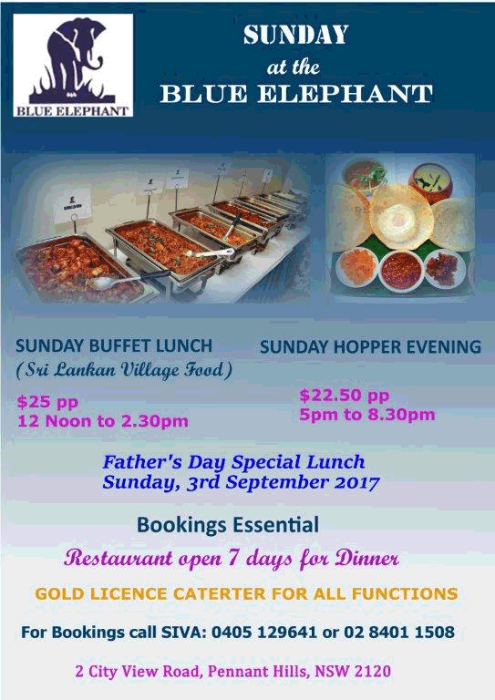 Sunday at the Blue Elephant Fathers Day Special Lunch Last updated: August 5, 2017 6:00 am By admin Share 0 Min Read SHARE Sunday at the Blue Elephant Fathers Day Special Lunch Share This Article Email Copy Link Print Previous Article Celebrate the Feast of Our Lady of Vailankanni Mother of Good Health Next Article Schoenstatt Annual Dinner Dance 2017 FacebookLikeYoutubeSubscribeLinkedInFollow Most Read “A PICTURE SPEAKS A 1000 WORDS” – By Des Kelly A Life Hack for when we’re Burnt Out & Broken Down – By Uma Panch Narration of the History of our Proud Ancestral (Orang Jawa) Heritage. by Noor R. Rahim eLanka Marriage Proposals Noel News Noel News- By Noel Whittaker EILEEN MARY SIBELLE DE SILVA (nee DISSANAYAKE) – 29 September 1922 – 6 April 2018 – A Woman of Value an Appreciation written by Mohini Gunasekera K.K.S. Cement Factory Dr.Harold Gunatillake’s 90th Birthday party Cricket: Sri Lanka’s women’s squad in Melbourne - Advertisement -