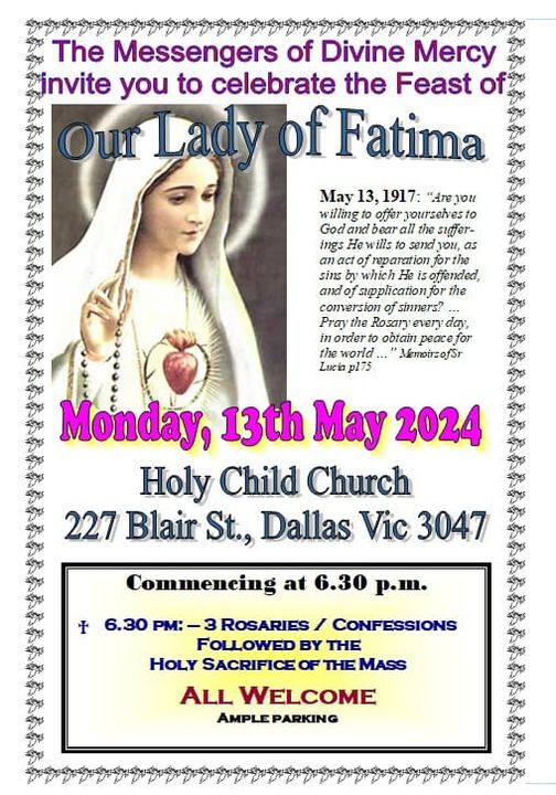 The Messengers of Divine Mercy invite you to Celebrate the Feast of Our Lady of Fatima Last updated: May 11, 2024 4:57 pm By eLanka adminByeLanka admin Share 0 Min Read SHARE The Messengers of Divine Mercy invite you to Celebrate the Feast of Our Lady of Fatima Monday,13th May 2024 at Holy Child Catholic Church 6.30 P.M Share This Article Email Copy Link Print Previous Article The Sri Lanka Association Of NSW INC’s Spring Ball – 19th October 2024 ( Sydney Event ) Next Article RCOBA Boys Night 2024 – 14 June 2024 7:00 PM – 11:30 PM ( Sydney Event ) FacebookLikeYoutubeSubscribeLinkedInFollow Most Read “A PICTURE SPEAKS A 1000 WORDS” – By Des Kelly A Life Hack for when we’re Burnt Out & Broken Down – By Uma Panch Narration of the History of our Proud Ancestral (Orang Jawa) Heritage. by Noor R. Rahim eLanka Marriage Proposals Noel News Noel News- By Noel Whittaker EILEEN MARY SIBELLE DE SILVA (nee DISSANAYAKE) – 29 September 1922 – 6 April 2018 – A Woman of Value an Appreciation written by Mohini Gunasekera K.K.S. Cement Factory Dr.Harold Gunatillake’s 90th Birthday party Cricket: Sri Lanka’s women’s squad in Melbourne - Advertisement -
