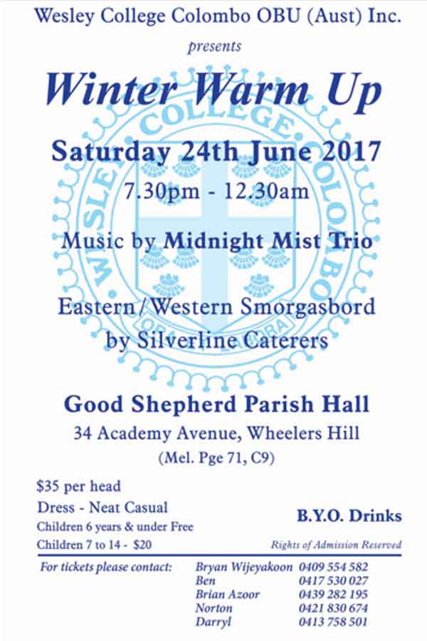 Wesley College Colombo OBU (Aust) Inc. presents Winter Warm Up Last updated: May 11, 2017 8:15 am By admin Share 0 Min Read SHARE Wesley College Colombo OBU (Aust) Inc. presents Winter Warm Up Share This Article Email Copy Link Print Previous Article CCC Foundation presents Out Of The Shadows Next Article Kaluthara Vidyalaya Proudly Presents The Evening of Elegance KVIANS Night FacebookLikeYoutubeSubscribeLinkedInFollow Most Read “A PICTURE SPEAKS A 1000 WORDS” – By Des Kelly A Life Hack for when we’re Burnt Out & Broken Down – By Uma Panch Narration of the History of our Proud Ancestral (Orang Jawa) Heritage. by Noor R. Rahim eLanka Marriage Proposals Noel News Noel News- By Noel Whittaker EILEEN MARY SIBELLE DE SILVA (nee DISSANAYAKE) – 29 September 1922 – 6 April 2018 – A Woman of Value an Appreciation written by Mohini Gunasekera K.K.S. Cement Factory Dr.Harold Gunatillake’s 90th Birthday party Cricket: Sri Lanka’s women’s squad in Melbourne - Advertisement -