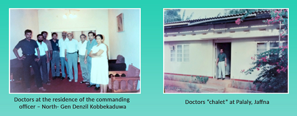 The civil doctors were provided with a separate house about 100 meters from the hospital. This was called the “Doctors Chalet”. After my first visit to Palaly, I was curious to know the exact meaning of a chalet. According to the Oxford Dictionary, it refers to a “small cabin in a holiday camp”. During the early days, this “chalet” did not have the basic facilities, but over time various improvements were carried out. However, on occasions, my friends on duty at the army camp in Palaly invited me to share their quarters. They were much better. I was lucky and I am grateful to these officers. There were also times that I was invited to the Commanding Officers Chalet. This was truly luxurious and red-carpeted with all the facilities. I occupied what was given and did my duty as I was there to serve and not to complain about facilities when the army was fighting a war.