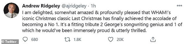 He wrote: ‘I am delighted, somewhat amazed & profoundly pleased that WHAM!’s iconic Christmas classic Last Christmas has finally achieved the accolade of becoming a No 1.