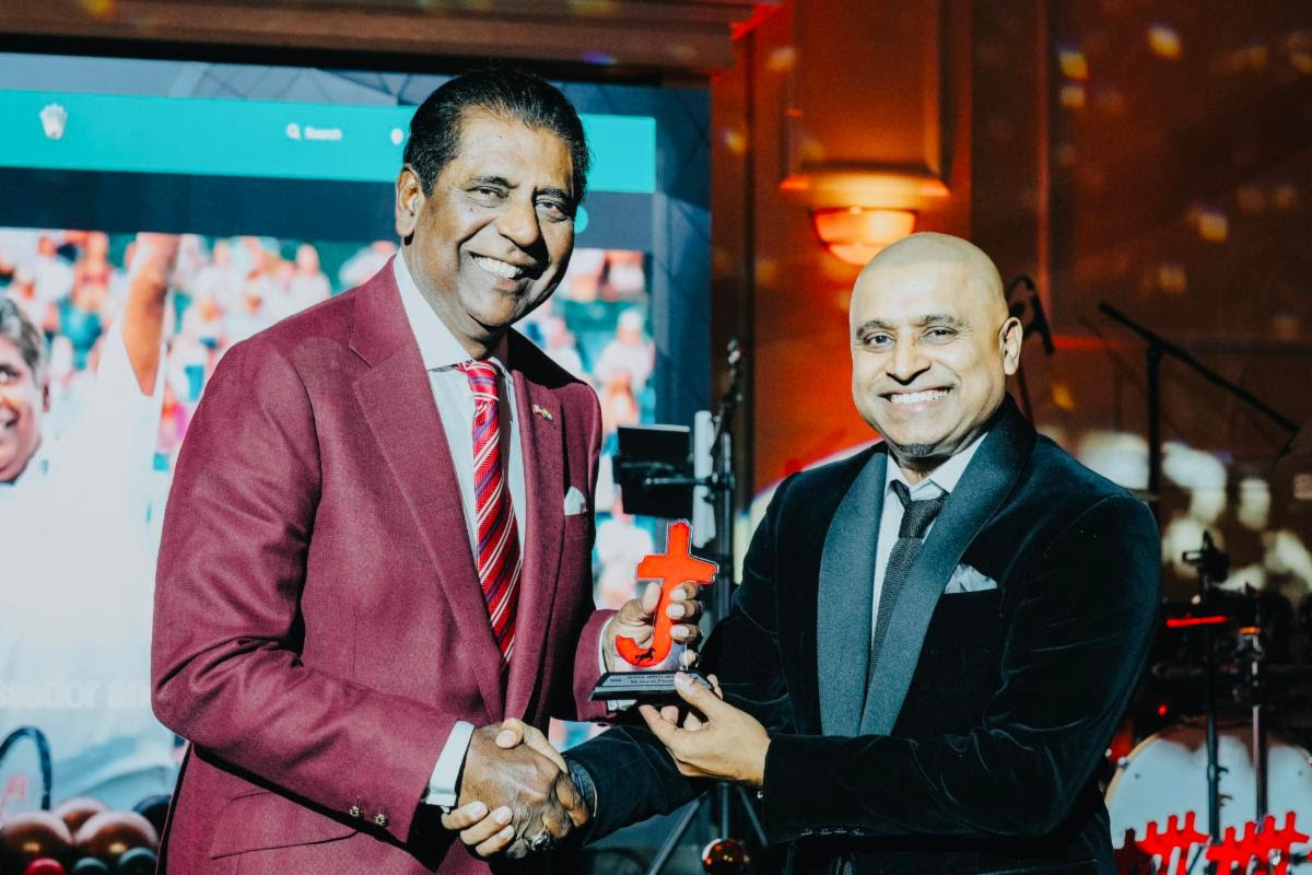 CEO of JMED Supplies, John Amirthiah presents award to Tennis Legend Vijay Amritraj at the Awards event.