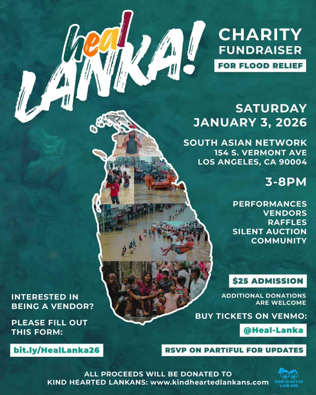 • Heal Lanka -Charity Fundraiser – For Flood Relief South Asian Network, 154 S. Vermont Avenue Los Angeles, Ca. 90004 Saturday, January 3rd, 2026