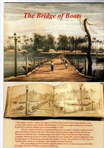 In British times it continued its importance and in 1822 the river was spanned by a “bridge of boats”, a pontoon bridge which was in use till 1895. A painting of this, by the Irish artist Andrew Nicholl in