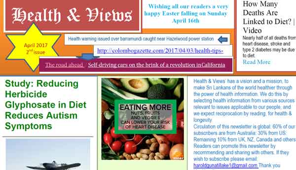 ArticlesDr Harold Gunatillake Health and views April 2nd issue 2017 issue – Health Education for Sri Lankans & others – by Dr Harold Gunatillake Last updated: June 14, 2023 4:45 pm By admin Share 0 Min Read SHARE Health and views April 2nd issue 2017 issue Health Education for Sri Lankans & others by Dr Harold Gunatillake TAGGED:Health and views April 2nd issue 2017 issue – Health Education for Sri Lankans & others – by Dr Harold Gunatillake Share This Article Email Copy Link Print Previous Article Minimise Your Processed Red Meat Eating –WHY? Next Article CHRISTIANITY ON T.V. by Des Kelly ‘the Star of eLanka’ FacebookLikeYoutubeSubscribeLinkedInFollow Most Read “A PICTURE SPEAKS A 1000 WORDS” – By Des Kelly A Life Hack for when we’re Burnt Out & Broken Down – By Uma Panch Narration of the History of our Proud Ancestral (Orang Jawa) Heritage. by Noor R. Rahim eLanka Marriage Proposals Noel News Noel News- By Noel Whittaker EILEEN MARY SIBELLE DE SILVA (nee DISSANAYAKE) – 29 September 1922 – 6 April 2018 – A Woman of Value an Appreciation written by Mohini Gunasekera K.K.S. Cement Factory Dr.Harold Gunatillake’s 90th Birthday party Cricket: Sri Lanka’s women’s squad in Melbourne - Advertisement -