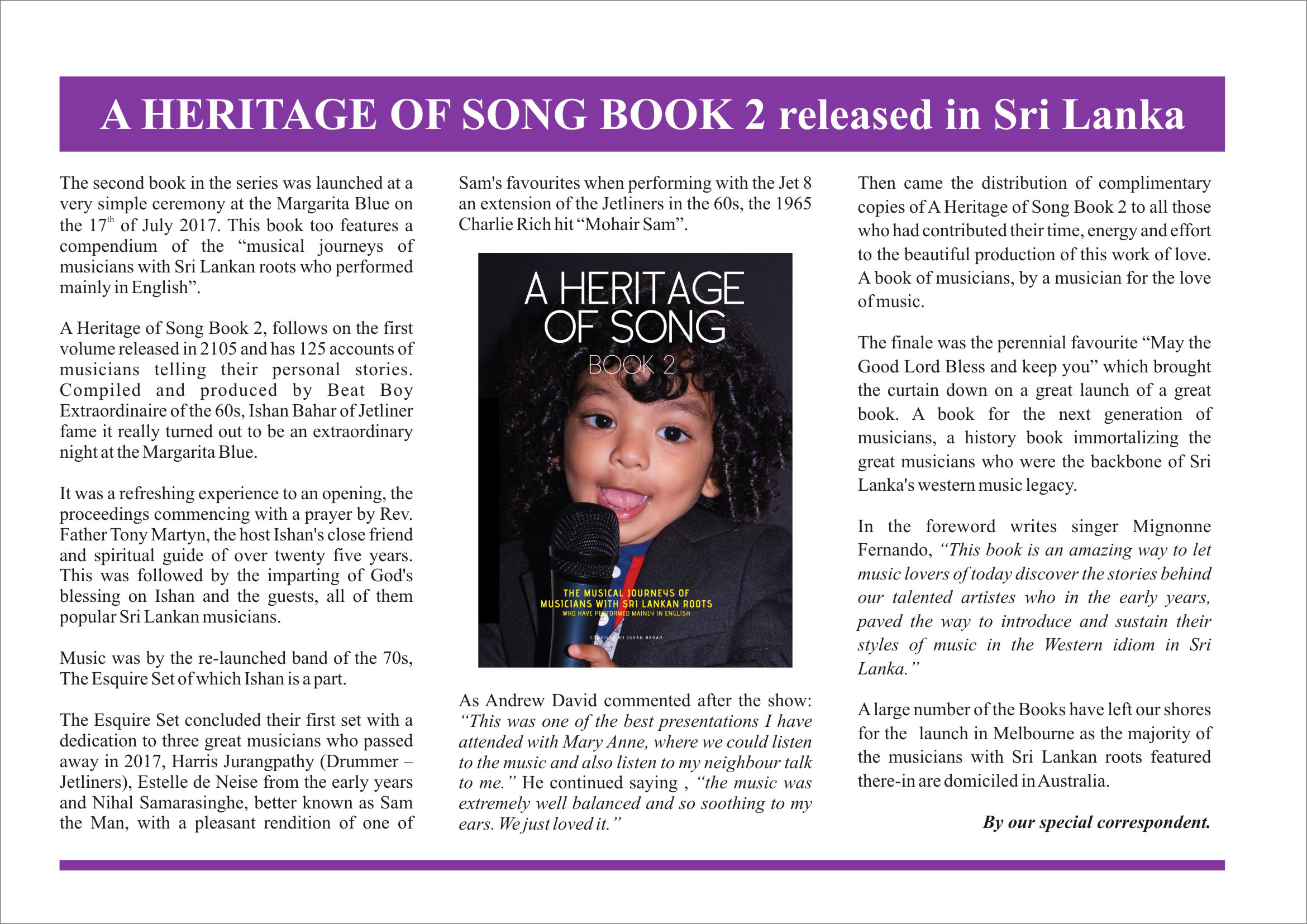Articles A Heritage of Song Book 2 released in Sri Lanka Last updated: August 18, 2017 9:19 am By admin Share 0 Min Read SHARE A Heritage of Song Book 2 released in Sri Lanka Please click here to view a larger version of this article TAGGED:A Heritage of Song Book 2 released in Sri Lanka Share This Article Email Copy Link Print Previous Article “SIGIRIYA” by Desmond Kelly ‘the Star of eLanka’ Next Article Hopper lunch by the Old Josephians FacebookLikeYoutubeSubscribeLinkedInFollow Most Read “A PICTURE SPEAKS A 1000 WORDS” – By Des Kelly A Life Hack for when we’re Burnt Out & Broken Down – By Uma Panch Narration of the History of our Proud Ancestral (Orang Jawa) Heritage. by Noor R. Rahim eLanka Marriage Proposals Noel News Noel News- By Noel Whittaker EILEEN MARY SIBELLE DE SILVA (nee DISSANAYAKE) – 29 September 1922 – 6 April 2018 – A Woman of Value an Appreciation written by Mohini Gunasekera K.K.S. Cement Factory Dr.Harold Gunatillake’s 90th Birthday party Cricket: Sri Lanka’s women’s squad in Melbourne - Advertisement -