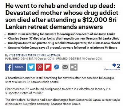 ago — was the hardest experience for British national Maryanne India Beare. Her son Charles Jeevan Beare, who wanted to cure his addiction to Ketamine, chose Seasons Lanka – the Sri Lankan branch of an Australian resort-type drug rehabilitation centre – that was relatively cheaper. Less than five weeks after him joining the rehab programme, Maryanne received news of her son’s death in their ancestral country, Sri Lanka, which she and her son