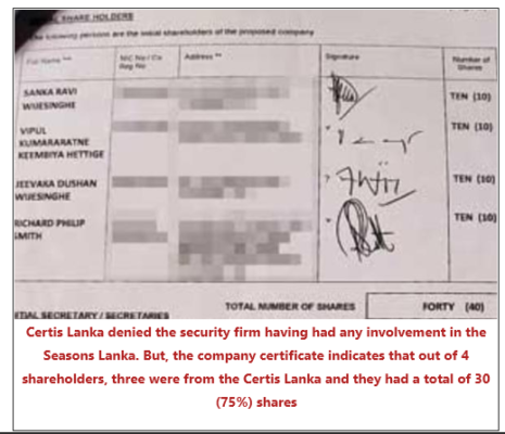 Jeevaka Wijesinghe denied the security firm having had any involvement in the Seasons Lanka programme except the rental commitment. Nevertheless, the registration certificate of Seasons Lanka Retreat (Pvt) Ltd mentions Jeevaka Wijesinghe as one of the four shareholders and initial directors. He has also signed as the Director of Seasons Lanka in the contracts of employees.