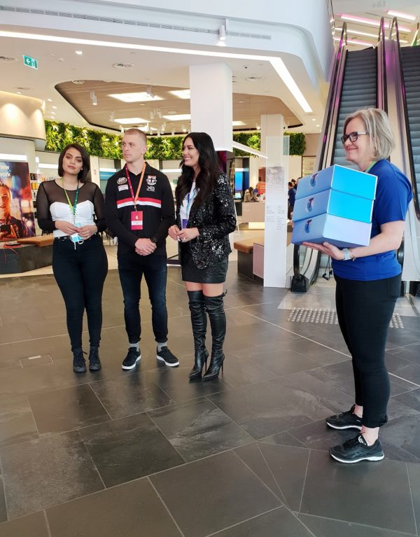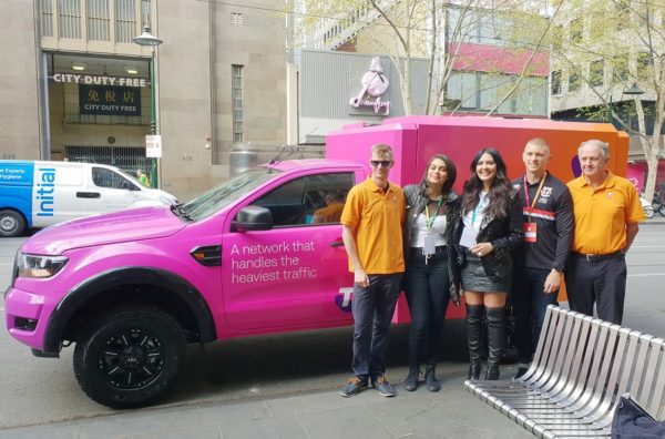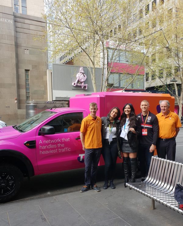 LtoR – Flanked by Telstra staff, singer Thelma Plum, TV star Lydia Schiavello and footballer Seb Ross