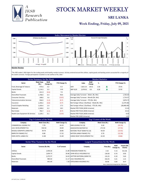 John Keells Stock Brokers (JKSB) – Sri Lanka – STOCK MARKET WEEKLY – STOCK MARKET WEEKLY 09-07-2021