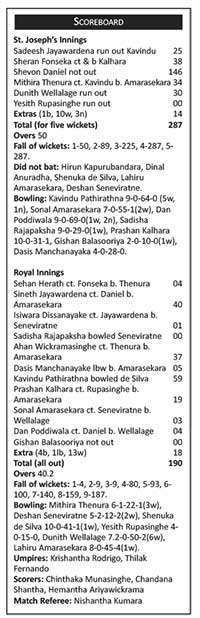 Deciding to bat, the Joes’ top order batted patiently before accelerating towards the end. Openers Sadeesh Jayawardena and Sheran Fonseka who remained unbeaten in their ten wicket win in the semi final against Trinity, added 50 runs for the first wicket. Jayawardena was run out for 25 and Fonseka was dismissed for 38 runs by Prashan Kalhara who caught him off his own bowling.