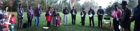 Then, as the autumn-sun set over the ancient forests of the Lane Cove national park, the group lit candles and stood in a circle observing two minutes silence. The white flowers were thrown into the Lane Cove River. The youngest and oldest participants jointly threw the last bunch of flowers into the water, to symbolize hope and continuity in spite of the tragedy of the past thirty years. The proceedings ended with the singing of the National Anthem in both Sinhala and Tamil. Once the proceedings ended every one stood at the edge of the water and watched the white flowers slowly drift away, carried by the gently flowing water of the Lane Cove River.